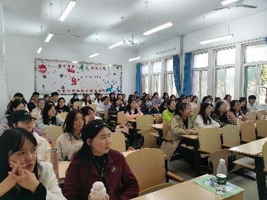 随后,徐彬教授正式展开“严肃科普与人文社科翻译实践”主题讲座。首先,徐彬教授介绍了自己历年的译著,立刻吸引了学生的目光。接着,徐教授与学生一起针对“翻译能力的构成”问题展开讨论,为学生成长为优秀翻译人才指明了方向。讲座中,徐教授着重对常见翻译失误展开细致讲解,运用生活化的翻译失误实例、穿插个人的翻译故事,生动形象地展示了由于语音句法、文化融合、知识差异等问题造成的翻译失误。徐教授还指出,语言工作者需“多读书、讲逻辑、勤查询、懂技术、善质疑、细思量”,建议学生遵循“生态阅读观”进行阅读,并推荐了读物、名著等多个种类的优秀英语阅读书目。