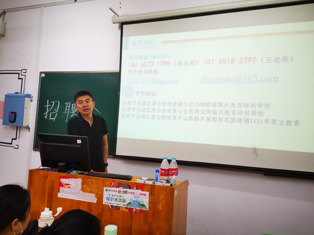 机构负责人向毕业生介绍了机构发展前景,课程体系和培训方式。随后,机构负责人对博兴教育培训学校的招聘条件、工作环境、教师培养、福利待遇以及招聘岗位等问题做了详细的介绍。接着,负责人向毕业生介绍机构较为严格的岗前培训和考核,讲解了毕业生进入机构前需具备的资历和应聘条件。最后,负责人回答了毕业生们提出的问题,现场气氛活跃。负责人诚邀我院毕业生前往博兴教育培训学校应聘就职,不少毕业生与机构负责人交流后达成了初步就业意向。