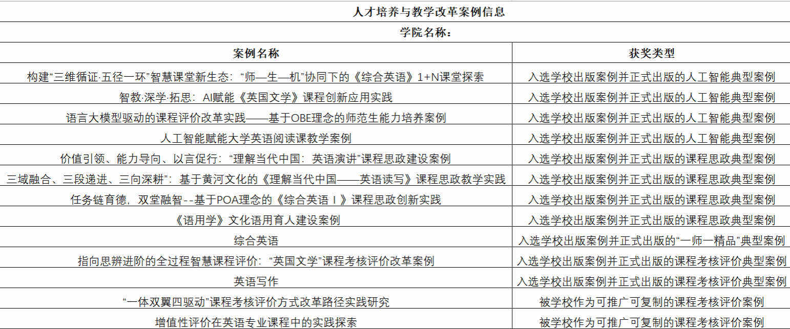 近日,在学校组织的人才培养与教学改革典型案例评选中,yl6809永利官网集团申报的系列成果获得全面肯定,共有13项案例入选全校推广名单,涵盖第二批“人工智能+高等教育”典型应用场景案例、课程思政典型案例、“一师一精品”典型案例及课程考核评价典型案例四大类别,充分展现了学院在人工智能赋能外语教学、课程思政深度融合、智慧课堂建设和多元评价改革方面的系统探索与突出成效。