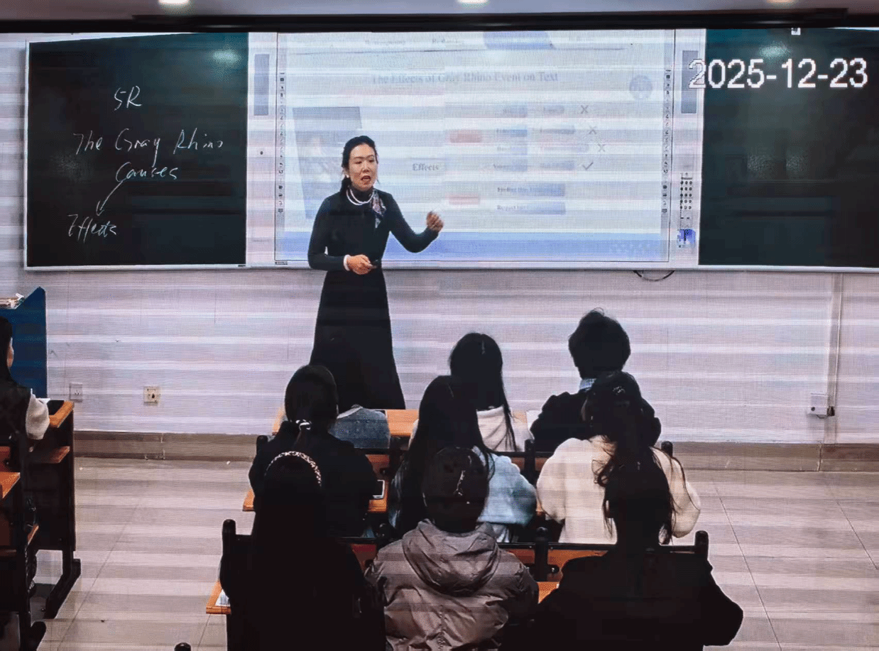 邹德平的示范课创新性地将“灰犀牛理论”融入语言教学场景,通过精心设计的教学环节与丰富多样的互动形式,使课堂节奏张弛有度,教学衔接自然流畅,充分展现了《综合英语》课程“语言应用+思想引领”的教学特色。邹德平借助现代教学手段,引导学生深入思考、积极表达,实现了语言能力与思维品质的同步提升,赢得了现场与线上观摩教师的一致好评。