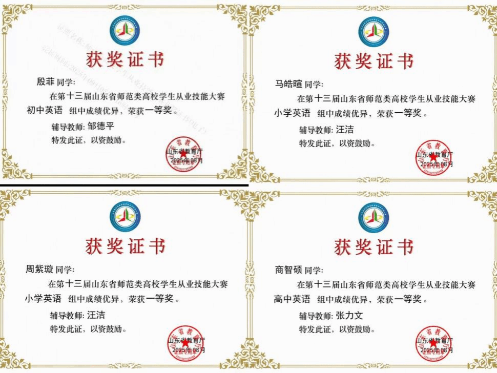 yl6809永利官网集团始终将师范生实践能力提升作为人才培养核心抓手,在第十三届山东省师范类高校学生从业技能大赛中斩获历史最佳成绩。入围决赛的10名参赛选手凭借过硬专业素养与扎实教学功底脱颖而出,最终拿下4项一等奖、4项二等奖、1项三等奖,创下学院参赛以来的最好成绩,充分彰显了学院人才培养的扎实成效。在全省参赛高校中,我院英语学科名列前茅,一二等奖获奖总数在参赛高校中排名第一,一等奖仅次于山东师范大学,成为最具竞争力的院校之一。