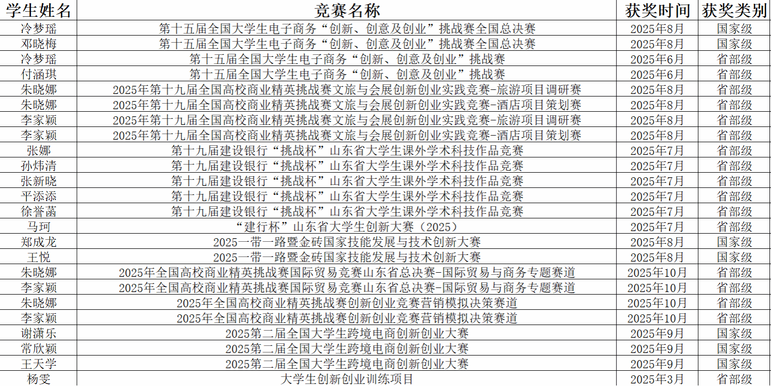 在2025年第十九届全国高校商业精英挑战赛创新创业竞赛中,2023级李家颖、朱晓娜等同学组成的团队凭借出色的外语表达能力和专业的商业策划方案,在文旅与会展、国际贸易及营销决策等赛道中勇夺4项省部级一等奖。