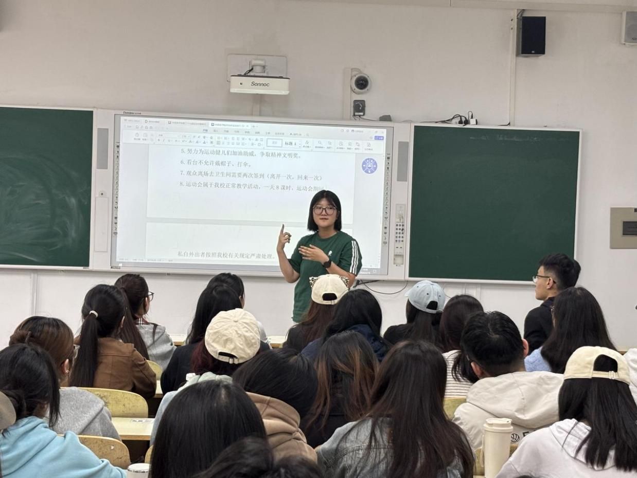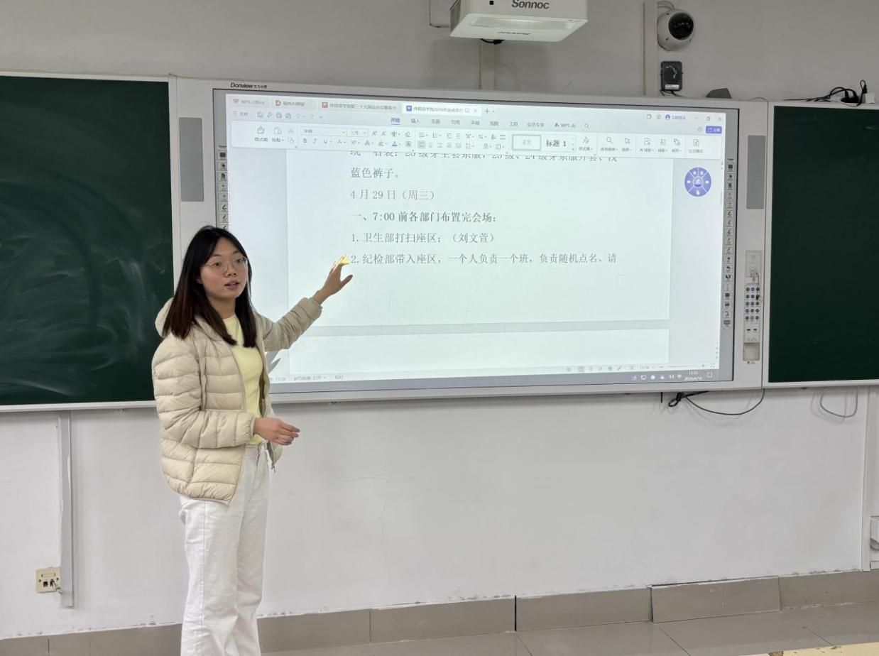 随后,学生会主席团成员李孟杰、毕坤就运动会后勤保障、看台秩序等重点工作进行全面梳理及安排。她们指出,赛会服务需实现"点对点"精准对接。同时,对看台观众的精神面貌提出明确标准,要求学生干部率先垂范,带头遵守赛场规则,营造文明有序的赛场氛围。