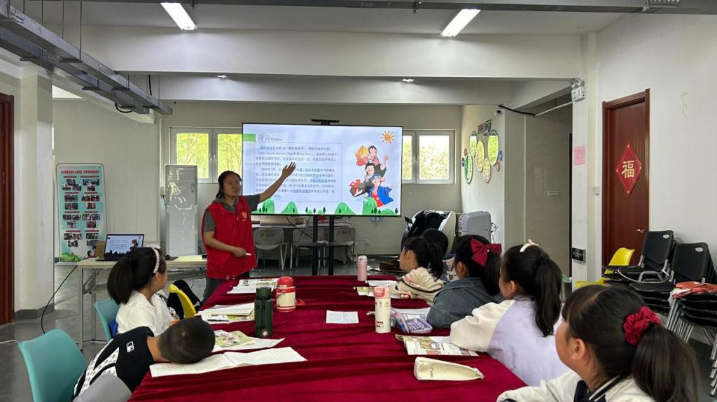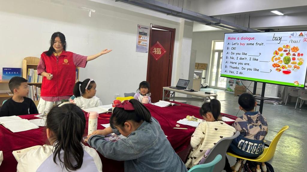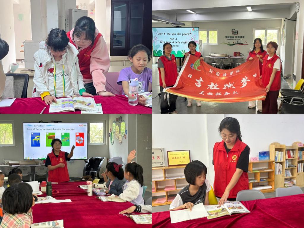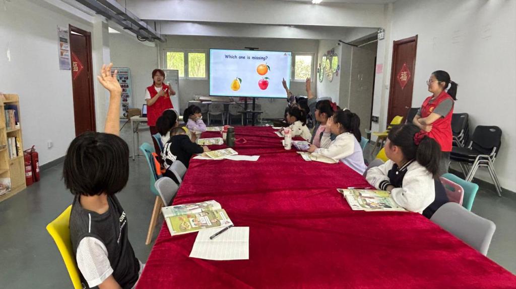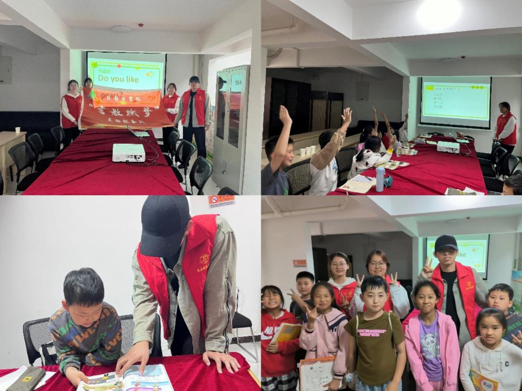 “言教燃梦”志愿服务队的志愿者曹睿典、张欣颖、米亿波、张欣悦四名同学满怀热忱前往山水泉城社区,为孩子们带去一堂充满活力、知识性与趣味性并存的英语课堂。