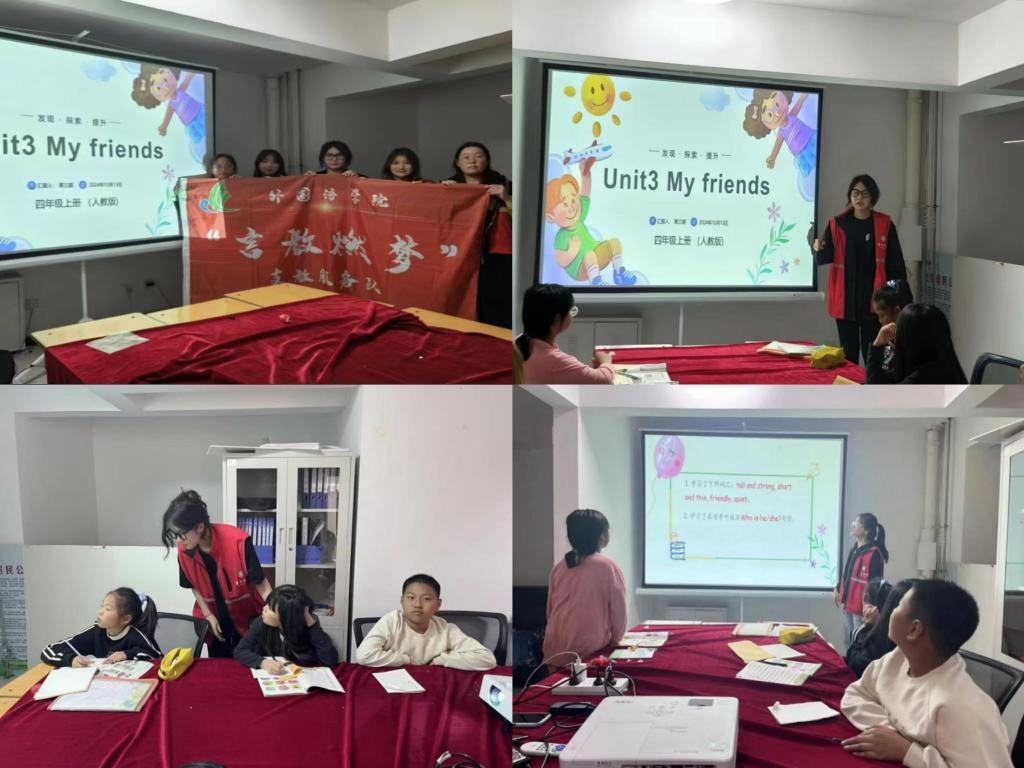 我们的课堂主题是“My Friends”,旨在帮助孩子们掌握描述朋友的词汇和句型,同时点燃他们心中对英语学习的热情。为了营造一个生动有趣的课堂氛围,我们精心准备了教学PPT、彩色卡片、图片和例句,还有英语小故事和歌曲。这些精心设计的材料,如同魔法般吸引了孩子们的注意力,让他们在课堂上焕发出了前所未有的活力。课程一开始,我们先带着孩子们回顾了上节课的内容,通过提问和讨论的方式,帮助他们巩固了所学知识。虽然有些孩子对上节课的内容还有些模糊,但在其他同学和我们队员的耐心帮助下,他们逐渐找回了记忆的碎片,脸上露出了恍然大悟的表情。