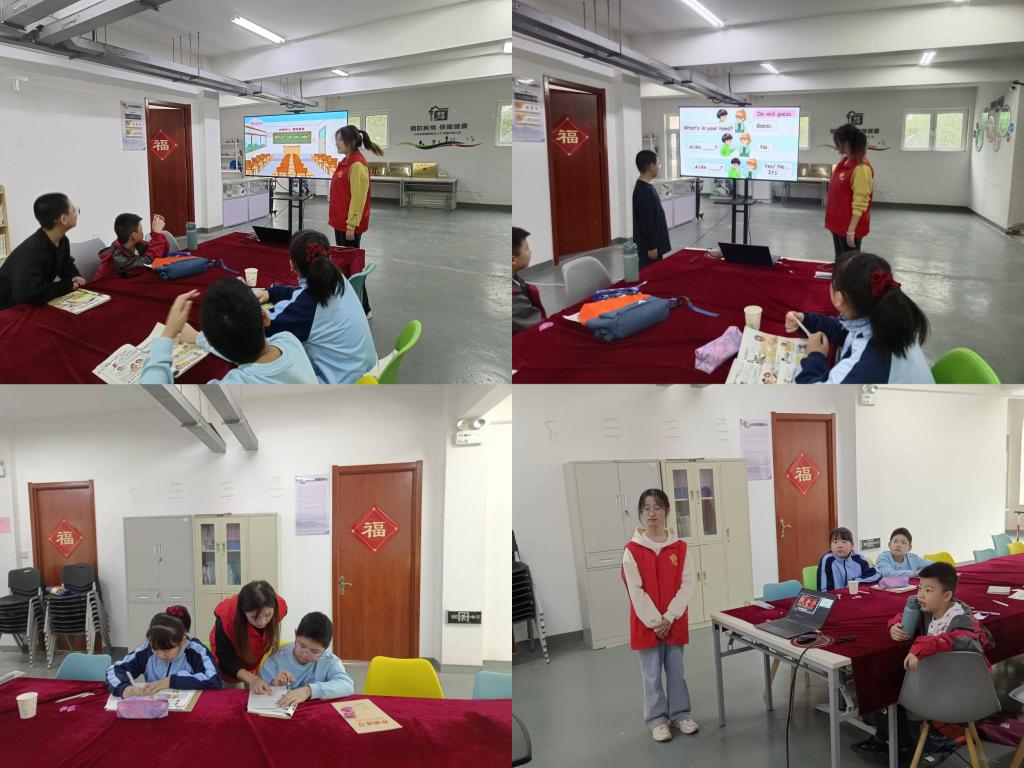 随后,我们正式进入了今天的学习内容,然而,在教授形容词“friendly、quiet”时,我们遇到了一些小挑战:有些孩子发音不准,难以掌握正确的发音。面对这个困难,我们队员并没有气馁,而是采取了多种方法来帮助孩子们纠正发音。我们让发音正确的同学起来示范,播放录音让孩子们跟读,还通过重复领读和分组练习的方式,让孩子们在情境中加深了对这些词汇的理解与记忆。