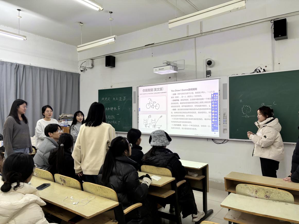 在经验分享之后,一系列的英语趣味游戏将现场气氛推向高潮。首先,王欣瑜带领大家进行了单词接龙游戏,同学们以排火车的方式展开激烈PK,不仅锻炼了词汇量,还激发了思维活力。随后,王欣瑜、刘雪携手组织了emoji猜词游戏,鼓励同学们发挥创造力与想象力,通过猜测emoji与英语俚语之间的联系,促进了思维的活跃与交流的愉悦。紧接着,亓一帆、王欣瑜、刘雪又带来了You draw I guess(你画我猜)游戏,同学们在比划与猜测中加深了对英语单词的理解与记忆,增进了彼此间的默契与合作。此外,张凯、杨丽丽还介绍了传话筒游戏,同学们在有限的时间内传递信息,不仅锻炼了听力和口语表达能力,还增强了团队间的信任与协作。