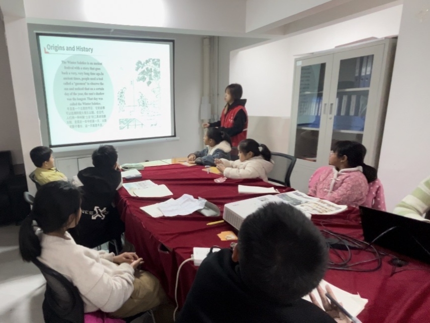复习完课内知识后,我们带着孩子们通过轻松的游戏放松了一会儿,随后便开启了冬至知识的探索之旅。通过视频讲解,我们向孩子们介绍了冬至相关的英语词汇和知识。从冬至的起源讲起,我们讲述了古老传说、历史变迁等,让孩子们知晓冬至在我国传统时令文化里的重要地位。