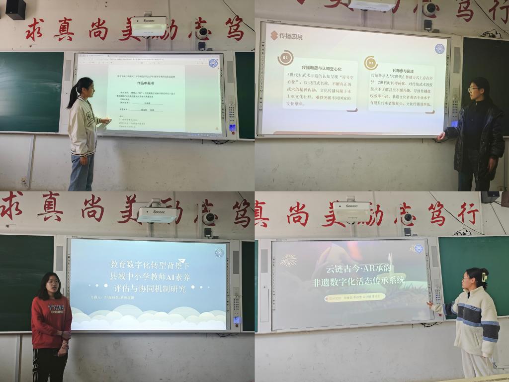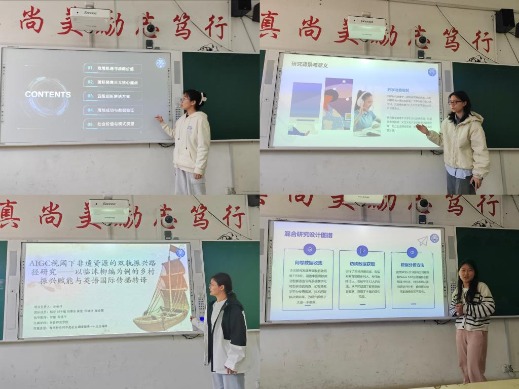 会议伊始,同学们依次进行了PPT展示,他们分别从研究主题、研究方法、实践调研、创新成果等多个维度对作品进行了介绍,全面展现了竞赛作品的内容。