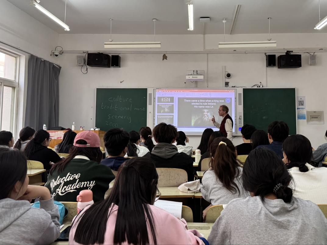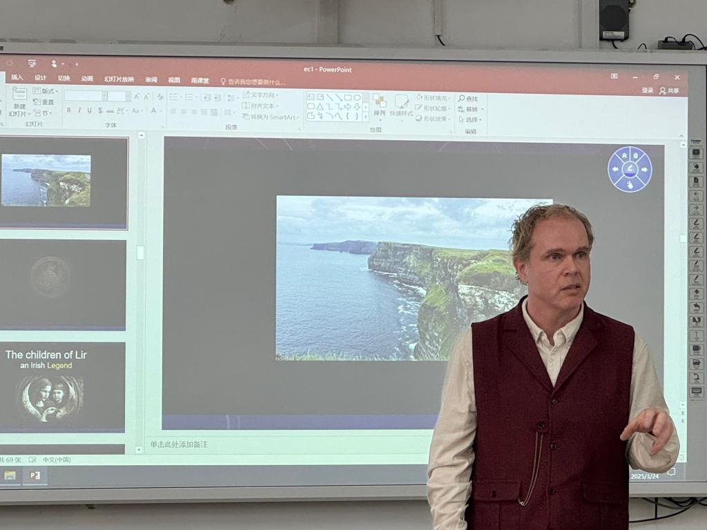活动开始,Eugene以一首节奏明快的《Newgrange》拉开序幕。紧接着,Eugene播放了一段悠扬的爱尔兰传统音乐,引领大家走进神秘而迷人的传统音乐殿堂。他生动地讲述了“The children of Lir an Irish Legend”等故事,在这个过程中,他不仅详细解释了故事里的重点词汇,帮助同学们深入理解,还耐心地带领大家逐句跟读,细致纠正发音,让同学们充分领略纯正英语的独特魅力。