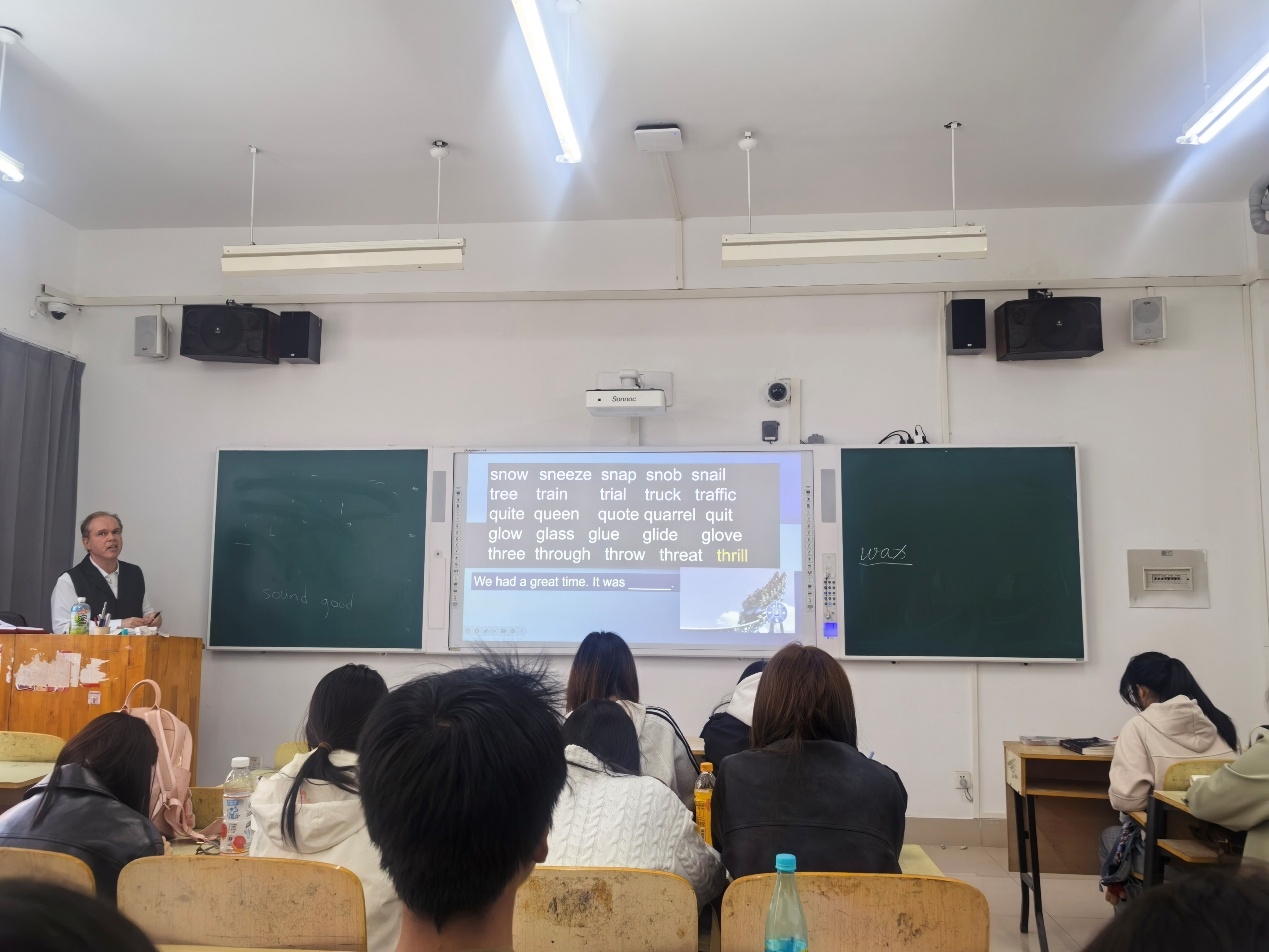 活动伊始,Eugene精心准备了练习发音环节,将发音和拼写相近的词汇放在一起进行针对性训练,像“throw”和“thrill” ,“trial和“train”,仔细讲解发音要点,让大家反复跟读、对比。接着,Eugene展示了一段基础对话示例,并鼓励同学们分组讨论,根据不同的设定场景进行对话拓展。最后,同学们全神贯注,积极参入到活动当中,大家在趣味互动中,英语能力得到了提升。
