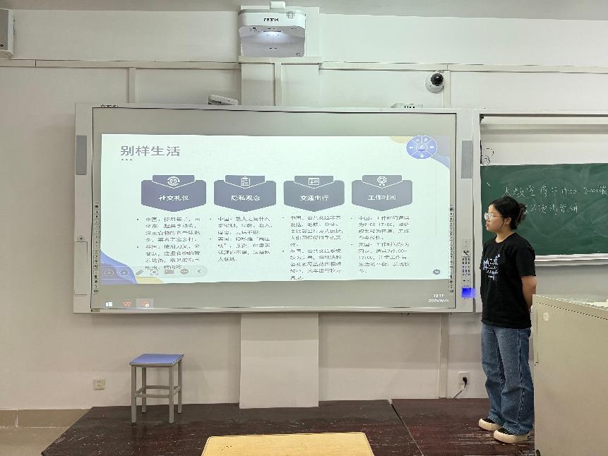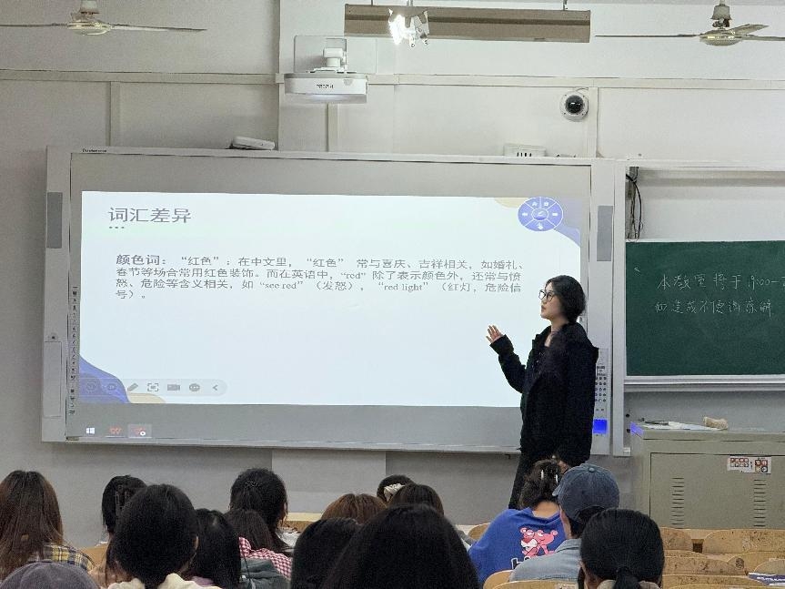 活动伊始,孙嘉慧以趣味小故事为引,引领大家踏上“交流语言差异大揭秘”的探索之旅。中英语言差异,犹如万花筒般绚丽多彩,不仅体现在色彩词汇的象征意义、日常用语的微妙差别,更渗透于表达习惯的深层逻辑之中。深入探究语言背后的文化逻辑,不仅能拓宽我们的文化视野,更能提升语言运用的精准度与灵活性,使表达更加得心应手。随后,孙英卓通过播放一段关于中英肢体语言差异的视频,让同学们直观领略到文化差异在肢体语言中的生动演绎。紧接着,她以“中英日常,别样生活”为话题,进一步向同学们展现了中英两国在生活习惯、社交礼仪等方面的鲜明对比,为在场同学带来了一场跨文化的视觉盛宴。