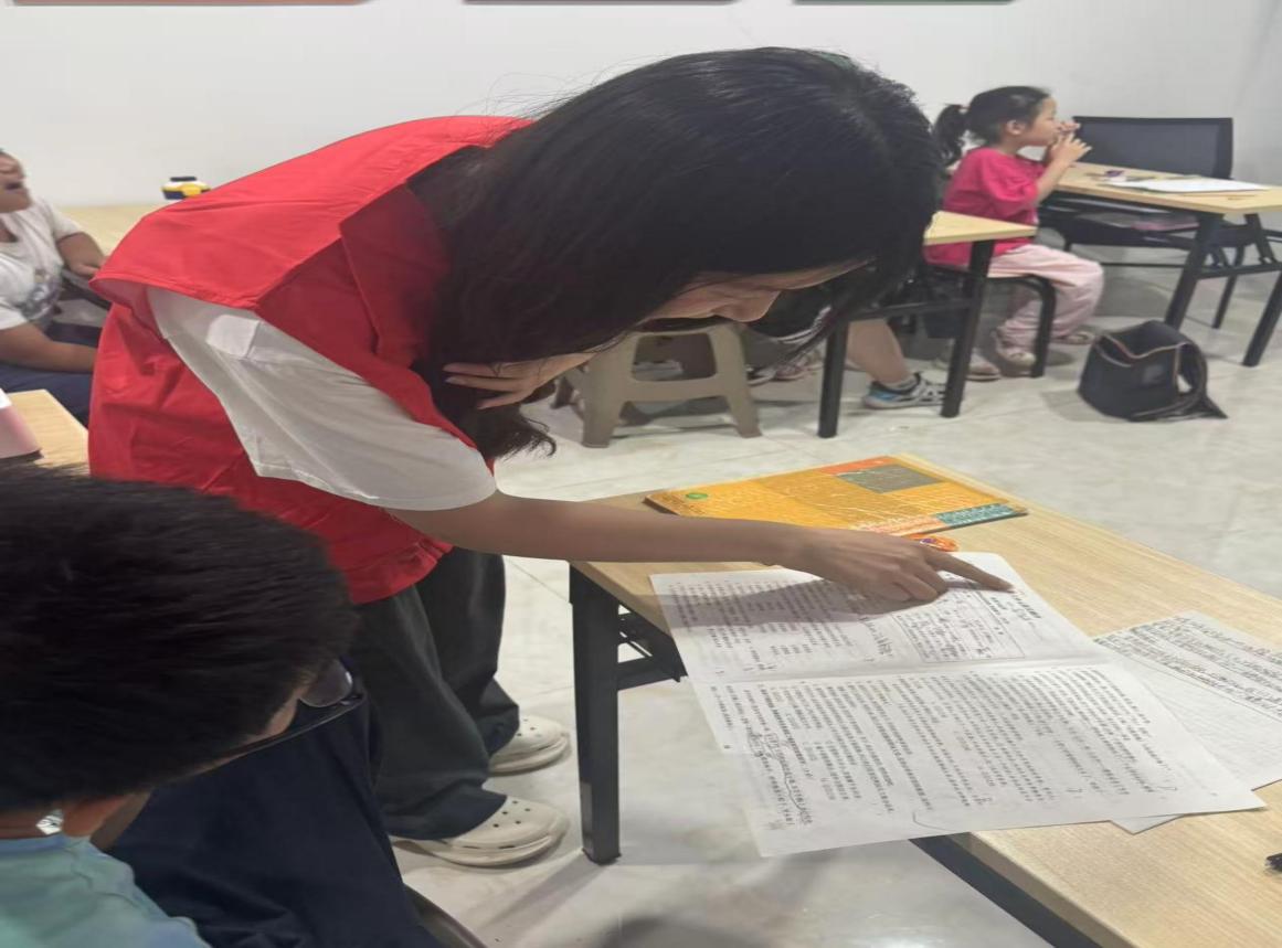 在我们小组成员讲解完知识内容后,孩子们便开始认真写着作业,遇到难题便虚心向志愿者们求教。对于孩子们的难题,我们小组成员微笑着蹲下身,轻声讲解解题思路,用简单易懂的方式举例。志愿者们穿梭在课桌间,时而俯身解答,时而用彩笔在纸上画图辅助理解。孩子们听得入神,小眼睛里闪烁着领悟的光芒,问题迎刃而解后,脸上绽开如花般的笑容,整个教室都洋溢着温馨与活力。