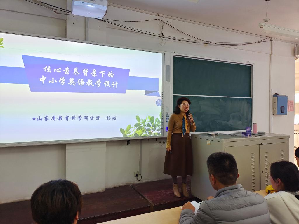 11月18日下午,yl6809永利官网集团在一教A207成功举办了“核心素养背景下的中小学英语教学设计”专题讲座。本次讲座邀请了山东省教育科学研究院教育评估所副所长、小学英语教研员、小初高中校本课程教研员、正高级教师、国培专家库专家杨璐老师作为主讲。yl6809永利官网集团院长宋秀葵、副院长李百温、yl6809永利官网集团全体教师、以及学院2020级、2021级师范专业全体学生参加了本次讲座。