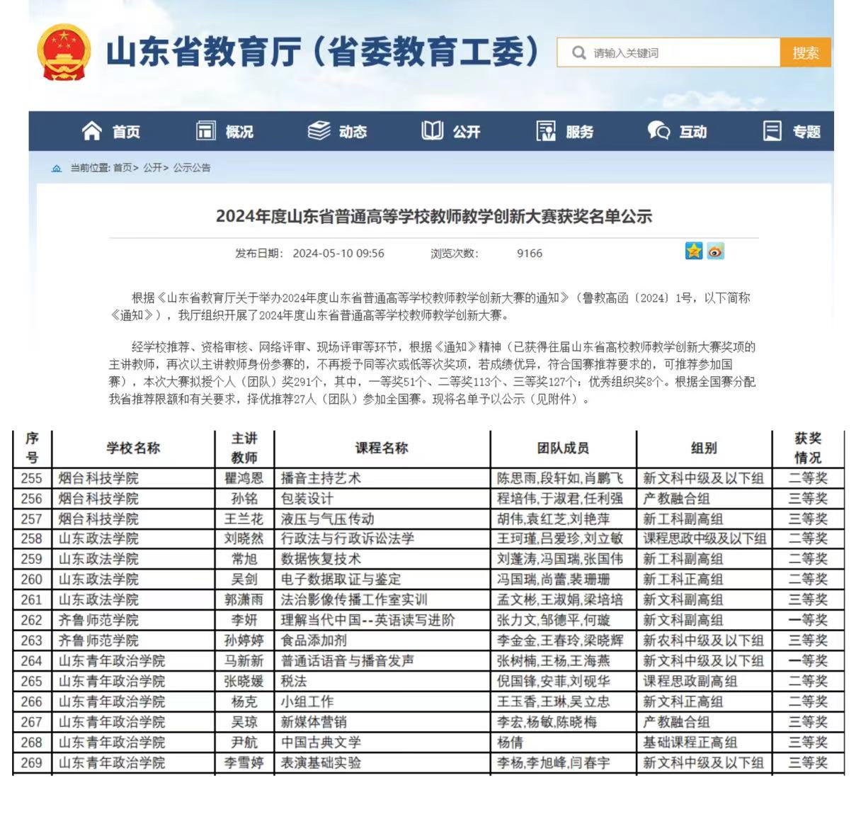 山东省普通高等学校教师教学创新大赛由山东省教育厅主办,是省内水平最高、参与最广泛、综合性最强的高校教学赛事之一。本届大赛以“推动教学创新、培养一流人才”为主题,深入推动高等教育教学改革,全面落实立德树人根本任务,有效助推“四新”和课程思政建设,推进信息技术与高等教育教学融合创新发展,提高产教融合协同育人成效。