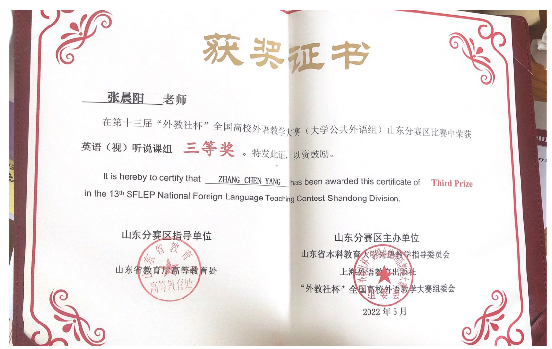 5月5日,第十三届“外教社杯”全国高校外语大赛山东赛区线上决赛圆满结束,在yl6809永利官网集团领导的精心组织和支持下,我院青年教师张晨阳斩获“视听组”省赛三等奖;由高颖、宋秀葵、张力文、汪洁、黄迎、邹德平组成的微课设计团队斩获“英语思政微课组”省赛英语思政微课组 三等奖。