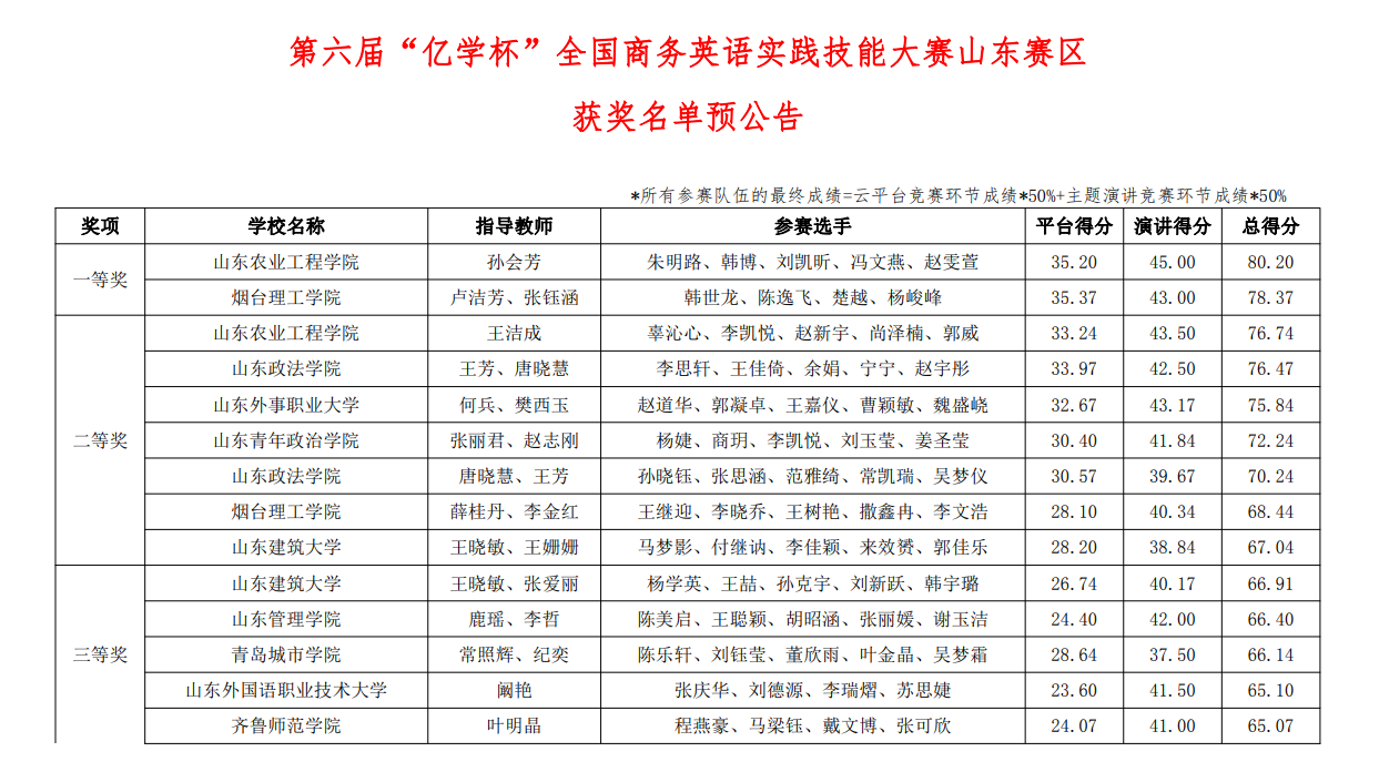 2022年8月23日,由中国国际商会商业行业商会商务英语研究委员会与全国大学生创新创业实践联盟举办的第六届“亿学杯”全国商务英语实践技能大赛省赛落下帷幕。商务英语专业本专科各选派一支团队由叶明晶老师指导代表学院参赛。本次比赛分为平台测试和主题演讲两部分,经过一个月的不断学习和打磨,本科团队荣获第六届“亿学杯”全国商务英语实践技能大赛山东赛区三等奖,专科团队荣获第六届“亿学杯”全国商务英语实践技能大赛全国突围赛一等奖并成功晋级全国总决赛。