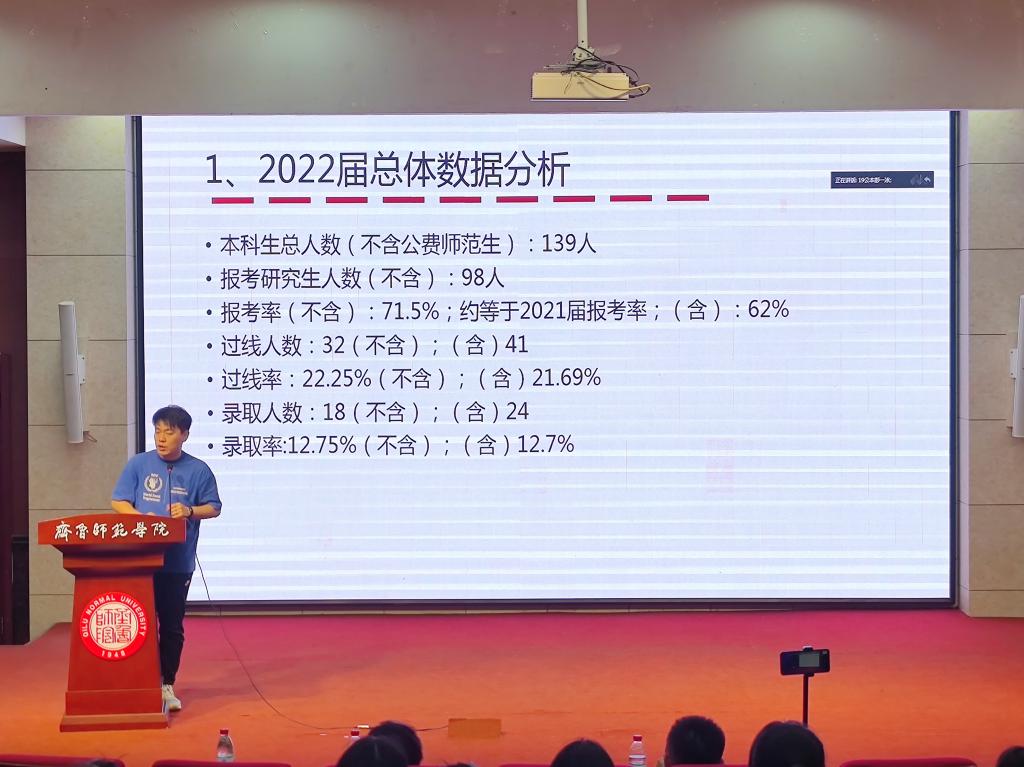 牛荦通过图表的方式从分数线、志愿分布、报考及录取情况三个方面对学院2022届考研相关数据进行了分析,在肯定了2022届考研学子成绩的同时,重点指出了当前考研同学中存在共性的问题,尤其是在报考志愿选择等方面还存在着眼高手低,能力素质与报考学校专业不匹配的倾向,提醒和鼓励2023届考研学生明确自身定位,理性报考院校及专业。同时要做到“两手抓”,即英语专业素养的硬实力与科研竞赛的软实力齐驱并进。