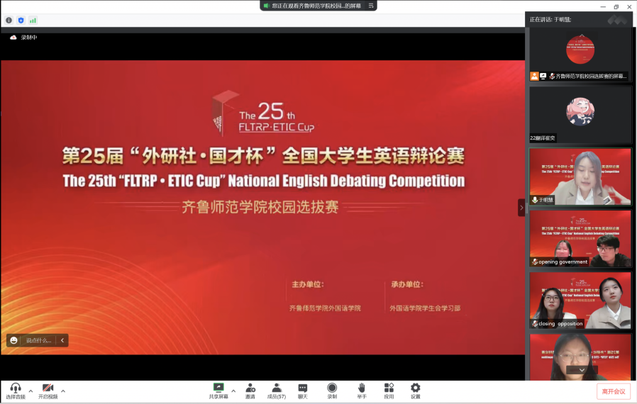 为引导yl6809永利官网集团学生积极践行社会主义核心价值观,加强校园文化建设,帮助学生开拓国际视野、强化学习意识,提升英语表达和思辨能力,培养兼具家国情怀和全球视野的国际沟通与传播人才,yl6809永利官网集团于3月21日晚线上举办了第25届“外研社·国才杯”全国大学生英语辩论赛校园选拔赛决赛。yl6809永利官网集团副院长谢士金、商务英语教研室主任石磊、英语专业教研室主任林德奖、陈锋博士、办公室副主任汪洁和青年教师刘烨担任评委。