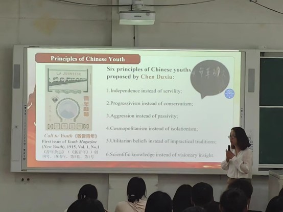此次党课把党性学习教育和英语专业学习相融合,以双语传党声、释国情。课上,张书记用英语与同学们探讨了当代青年使命,指出不能忘记近现代中国的百年屈辱史,没有中国共产党的正确路线和引领,中国人民就不可能站起来,富起来,强起来。如今当代中国在国际舞台上尽显大国风范,取得了举世瞩目的成就,我们比历史上任何时期都更接近、更有信心和能力实现中华民族伟大复兴。面对此百年未有之大变局,作为当代青年,生逢其时,也重任在肩。张书记还在课上阐述了当代青年学子该如何理解当代中国,弘扬时代精神,如何明确青年的使命,以榜样为引领,担当起弘扬时代精神,复兴民族大业的历史使命,鼓励大家争做有理想、敢担当、能吃苦、肯奋斗的新时代好青年。