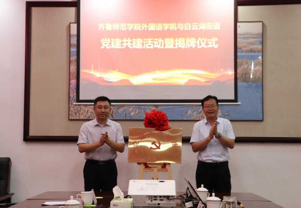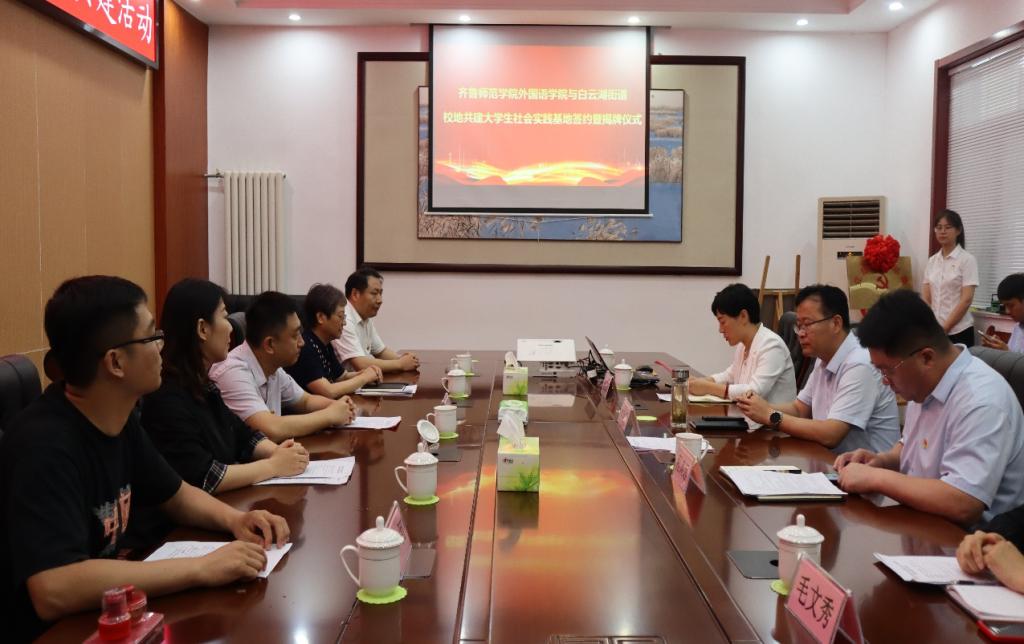 为推动学习贯彻习近平新时代中国特色社会主义思想主题教育走深走实,进一步强化党建引领,推进校地融合、双向共建,搭建大学生社会实践平台,7月13日上午,yl6809永利官网集团与章丘区白云湖街道举办“党建共建暨大学生社会实践基地”签约揭牌活动。yl6809永利官网集团党委书记于江、院长宋秀葵,白云湖街道党工委书记袁致甲、办事处主任程涛远,yl6809永利官网集团副书记迟英娟、副院长谢士金,白云湖街道党工委副书记董丽芳、组织委员毛文秀出席签约揭牌仪式;yl6809永利官网集团辅导员邵河以及15名暑期“三下乡”社会实践服务队队员参加仪式。