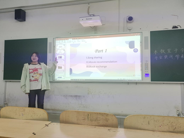 活动伊始,李嘉睿首先介绍了本次活动的基本流程和分享内容,随后正式开始了关于英语歌曲、电影与书籍的分享。首先,辅导团成员刘畅带来了他在英语歌曲、经典电影及书籍方面的独特见解与精彩推荐。他以一首首旋律优美的英文歌曲,引领大家感受音乐与语言的和谐之美,激发了现场同学对英语歌曲的浓厚兴趣;并且通过生动有趣的电影片段和引人入胜的书籍摘要,展现了英语文化的丰富多彩,拓宽了同学们的英语学习视野。