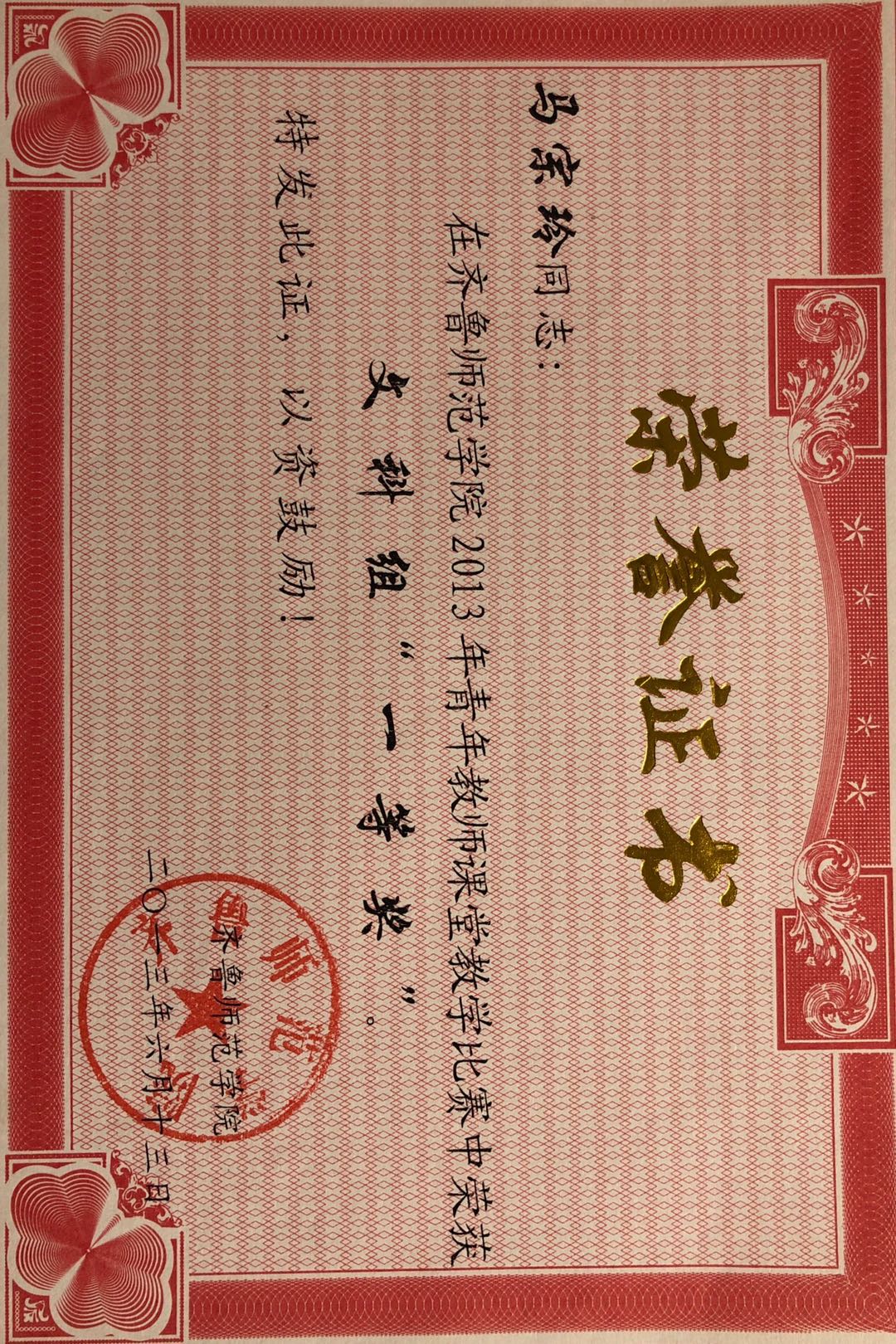 马宗玲老师在yl6809永利集团2013年青年教师课堂教学比赛中荣获文科组“一等奖”。