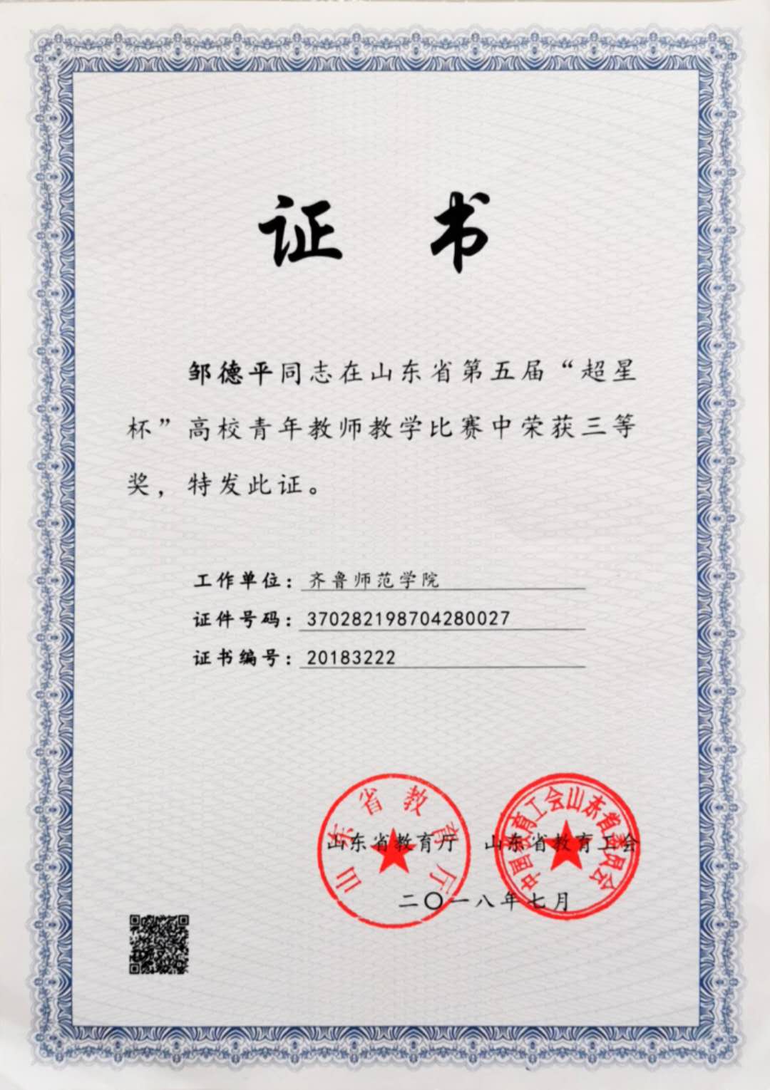 邹德平老师2018在山东省第五届“超星杯”高校青年教师教学比赛中荣获三等奖。