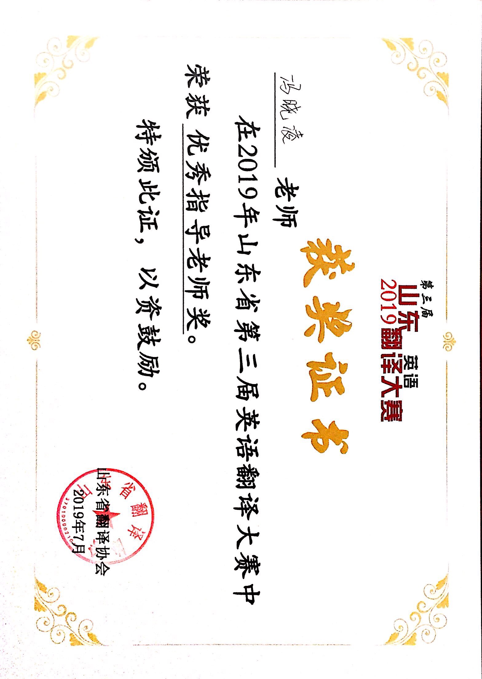 冯晓凌老师在2019年山东省第三届英语翻译大赛中荣获优秀指导老师奖。