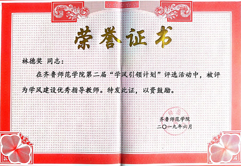 林德奖老师在2019yl6809永利集团第二届“学风引领计划”评选活动中荣获学风建设优秀指导教师荣誉称号。