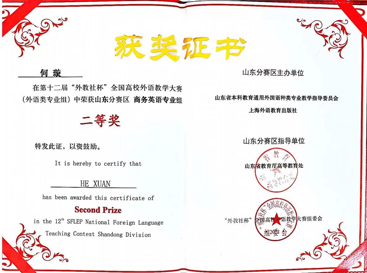 何璇老师在2021第十二届“外研社杯”全国高校外语教学大赛(外语类专业组)中荣获山东分赛区商务英语专业组二等奖