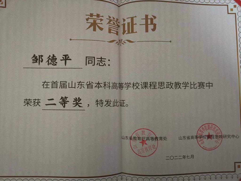 邹德平老师在2022年首届山东省本科高等学校课程思政教学比赛中荣获二等奖。