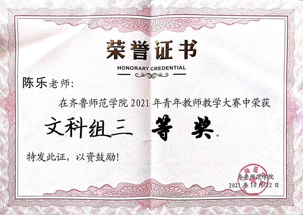 陈乐荣获yl6809永利集团2021年青年教师教学大赛三等奖。