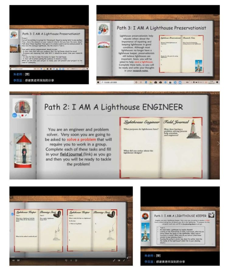 黄教授又以该绘本为例讲解了如何利用项目式阅读处理文本。分为三个路径:1.如果我是一个灯塔管理者。2.如果我是一个灯塔工程师。3.如果我是一个灯塔保护者。每个路径下分为三个小任务,最后是一个项目任务。每个路径下的任务都有不同的记录方式。灯塔管理者的记录方式是planning sheet。灯塔工程师的是field journal。灯塔保护者的是research notes。