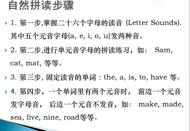 董老师先总结了自然拼读的学习步骤。在此基础上分析总结了自然拼读的教学步骤:第一阶段:为孩子创造一个良好的英语语言环境, 多接触多听英语, 从生活的各个方面着手, 建立英语语音和实物图象之间的关系。第二阶段: 在孩子能听懂绝大部分生活用语, 听力词汇量达到一定水平后,教孩子ABC字母和PHONICS英语读音规则。第三阶段:在孩子学会PHONICS英语读音规则后,开始找一些简单的小图画书让孩子练习阅读。第四阶段:逐步提高孩子的阅读难度和阅读量,广泛接触各个方面的英语。感觉受益。