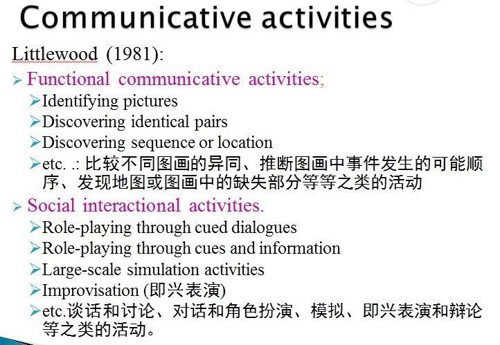交际教学法是一种有意义且更贴近生活的方法,语言的多样性的体现让学生更好的理解和学 习英语。通过回顾交际能力理论的学习,我们学会从语言能力、语用能力、篇章能力、策略能力、语言流畅能力全面培养学生。从找图片的不同、对话表演等例子让我们明确如何有效设计交际法活动。