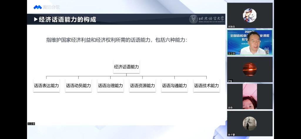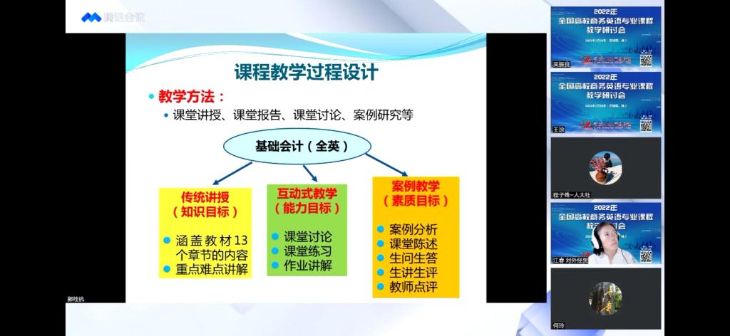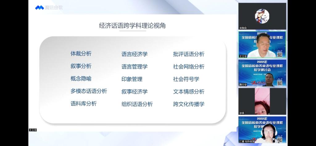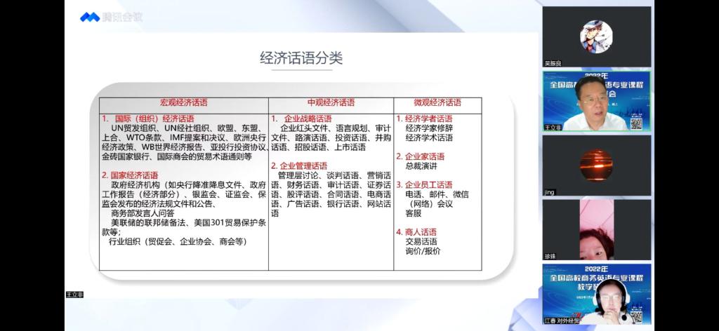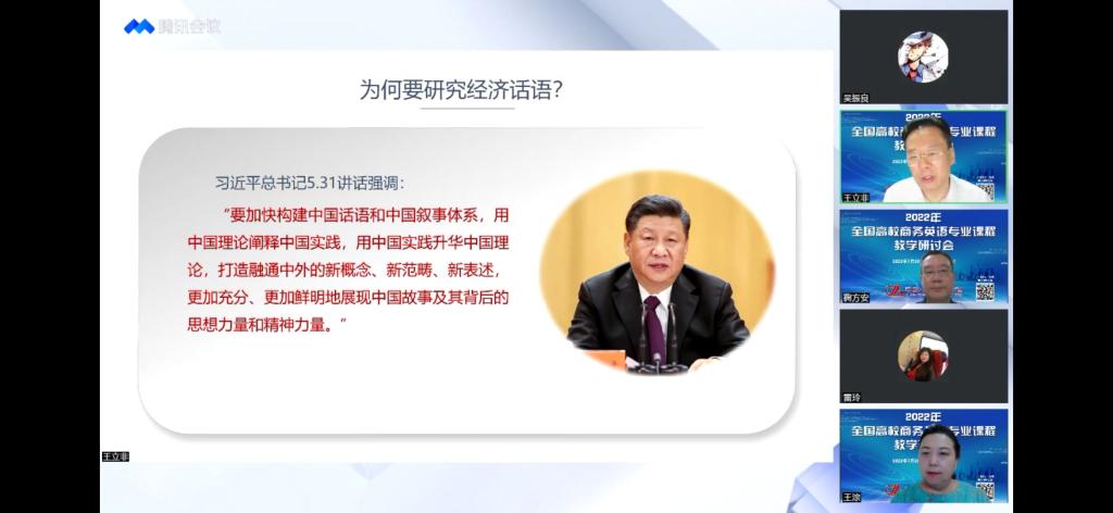 研讨会讲座主要围绕商务英语专业教学新方法、新形式、如何把商务英语专业学生实践和实训融入到实际教学过程中、疫情影响下商务英语专业毕业生就业情况和前景、新时代商务英语专业教学的人才培养、跨文化商务英语传播教学等主题进行。北京语言大学国际语言服务研究院院长王立非教授以“经济话语研究跨学科理论与方法”为主题、广东外语外贸大学国际商务英语学院院长郭桂杭教授以“商务英语一流专业课程建设”为主题,对外经济贸易大学英语学院副院长江春教授以“高级商务英语听说”课程为例来分享国家一流本科课程建设经验,西安翻译学院颖创研究院院长王淙教授的报告以“新文科建设中商务英语实践教学的新路径”为主题,专家们分别从不同角度对商务英语教学专业课程的设置提供了新的思路以及改革创新的路径。