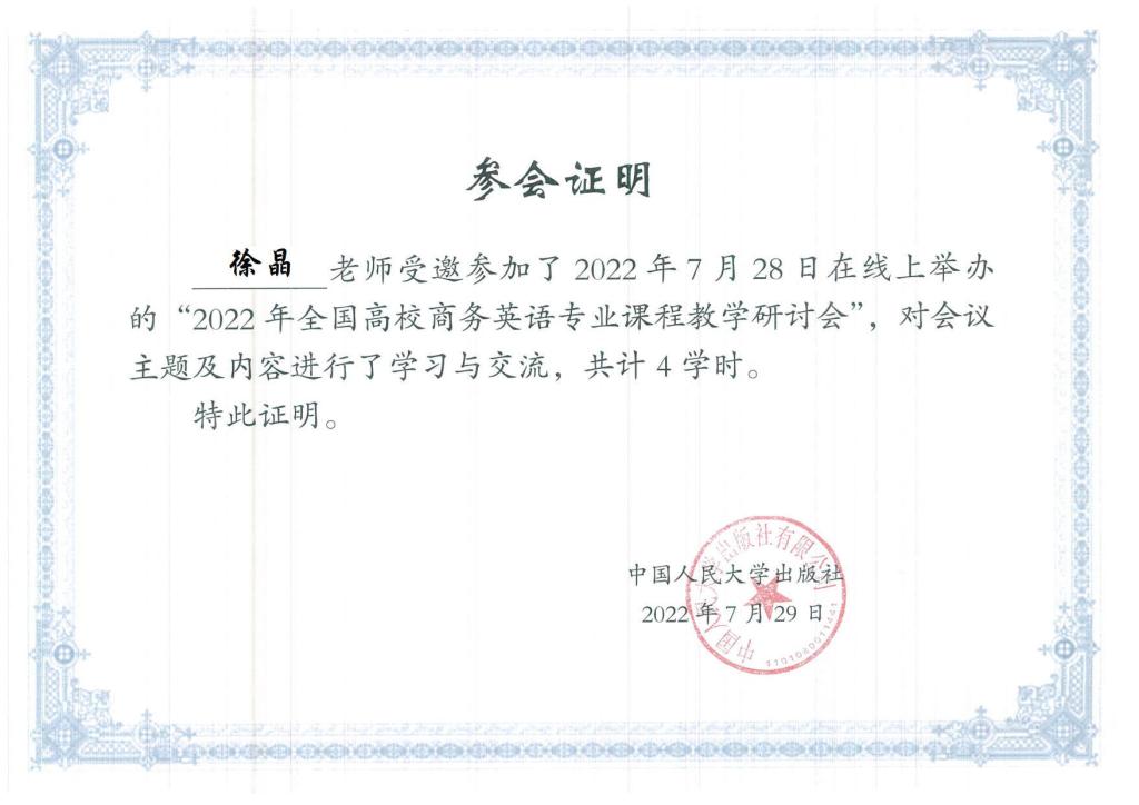 2022年7月28日,商务英语教研室徐晶老师通过线上的形式参加了由中国人民大学出版社主办的“2022年全国高校商务英语专业课程教学研讨会”,并取得研修证书。