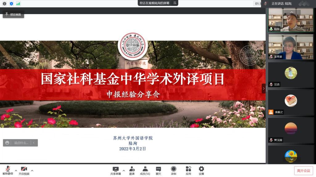 3月2日晚,yl6809永利官网集团特邀苏州大学孟祥春教授、陆洵教授开展了国家社科基金中华学术外译项目申报经验分享,两位教授分别做了题为“中华学术外译项目申报兼文化翻译策略与学术创新”、“中华学术外译项目申报解读”的学术报告。报告采取腾讯会议的形式,由yl6809永利官网集团院长宋秀葵主持,副院长李百温及全体教师聆听了本次报告。