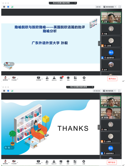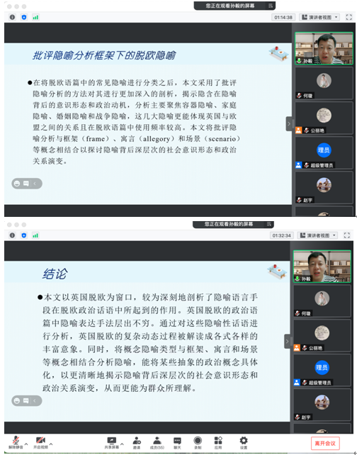 10月27日晚,yl6809永利官网集团特邀广东外语外贸大学孙毅教授作了题为“隐喻脱欧与脱欧隐喻—英国脱欧语篇的批评隐喻分析”的线上学术讲座。本次讲座由yl6809永利官网集团院长宋秀葵主持,副院长李百温、学院全体教师共同聆听了此次讲座。