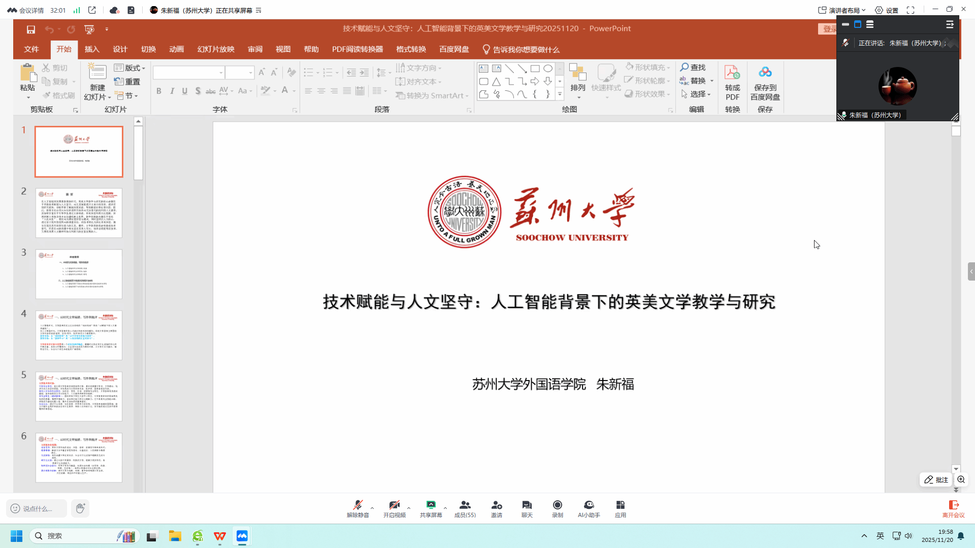 为进一步提升学院教师外语教科研能力和学科建设水平,yl6809永利官网集团于2025年11月20日邀请苏州大学朱新福教授为我院教师线上做了题为“技术指赋能与人文坚守:人工智能背景下的英美文学教学与研究”的学术讲座。讲座由yl6809永利官网集团院长宋秀葵主持,学院全体教师参加。