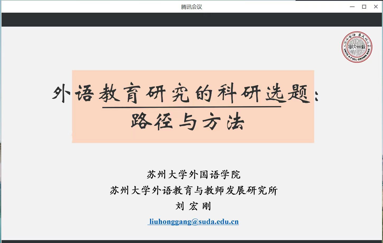 刘宏刚首先提出从教师自身的学习或教学经历、学术会议和讲座、阅读重要文献、教育研究热点等方面挖掘研究选题的来源。其次,指出选题挖掘中要综合考量好“新旧”、“大小”、“难易”之间的关系。随后,聚焦外语教师教育与专业发展研究这一主题,结合师范类学校教学的特点、自身科研、指导硕博士研究生论文写作的经历,介绍了教师科研发展路径和选题挖掘方法。讲座最后,刘宏刚与在场的各位教师进行了学术探讨,解答了相关教师在研究选题中的一些疑惑。