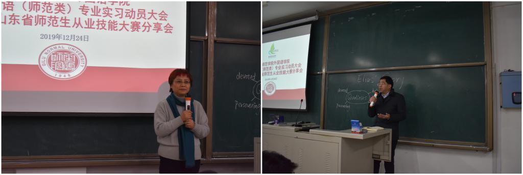 yl6809永利官网集团于12月24日15:30,在一教A207召开2017级英语(师范类)专业实习动员大会暨2019年山东省师范生从业技能大赛分享会,yl6809永利官网集团副院长宋秀葵、党总支副书记郁志营、教研室主任与副主任、办公室、团总支以及2019年山东省师范生从业技能大赛的指导教师、2017级及2019级英语(专升本)全体学生参加会议。会议由学院办公室主任栾毅之主持。