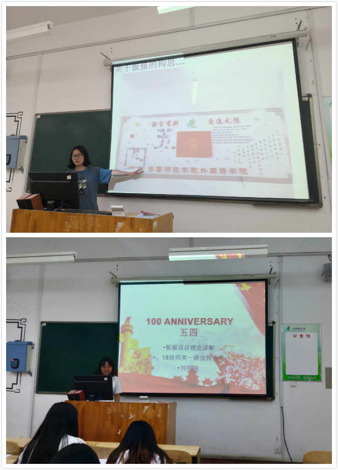 活动伊始,主持人上台介绍本次活动的意义,并对评委团和观众的到来表示感谢;接着参赛选手按照抽签顺序上台以PPT的方式进行3-5分钟展示,汇报本班板报设计理念。这些板报设计形式多样,有些将体现爱国精神的标语组成“五四”字样,有些用彩笔绘画出水墨丹青,有些是英文书写的有关五四精神的优秀作品,有些是以励志话语和照片组成的合集,更有自制的千纸鹤、小花等装饰。比赛在轻松愉悦的氛围中进行,展示结束后由评委团进行现场投票,相关人员收集和统计分数。颁奖仪式于晚上8点40在一教A112举行,结合初赛和复赛所得分数,一等奖由17级师英一班、17级师英二班取得,二等奖由17级师英三班、18级级商英二班取得,三等奖由18级师英一班、18级翻译一班、18级免师一班取得,优秀奖由18级免师二班、18级商英一班取得。本次比赛顺利结束。