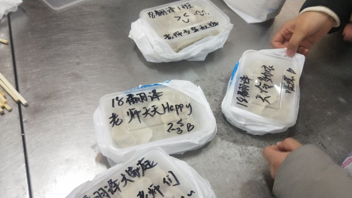 随后,同学们将饺子分装打包,并在盒子上写下献给老师和学校工作人员的暖心语录,用精心挑选的小袋子装好,将满满的心意带给每天辛勤奉献的老师和其他工作人员。最后,同学们分为四个小组,带着打包好的饺子,走在校园的各个角落,把热腾腾的饺子送给了为同学们日常生活奉献的宿管、门卫、保洁处的叔叔阿姨们,以及每天对同学们学习、生活关怀备至的学院领导、老师们。