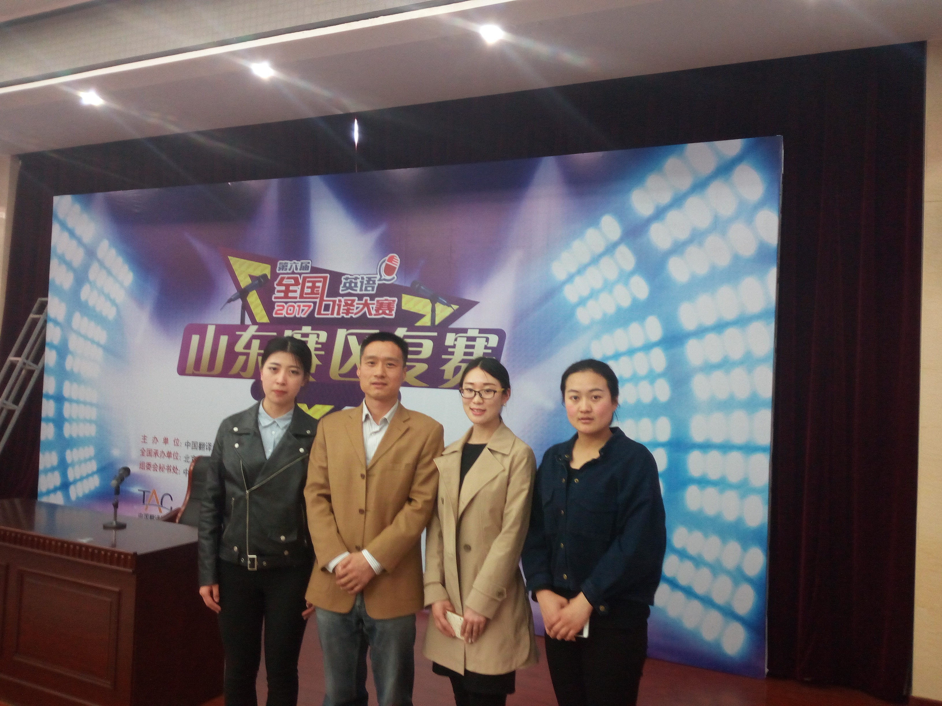 第六届全国口译大赛(英语)山东赛区复赛于2017年4月22日在山东外事服务大厅隆重举行。全省各高校共115名选手参赛。我院选派刘锦豫、刘昭君、李长璐三名同学参赛。比赛分两个阶段,赛题内容分为英译中与中译英。第一阶段是英译中,内容为200至250词英语讲话一篇,选手听完英文录音后备考,上台后只回答汉语答案,时间为90秒。第二阶段是中译英,内容为350至400字汉语讲话一篇,选手在台上听完汉语录音后当场翻译,时间为120秒。我院三名选手临危不惧,顶住压力,坚持到最后,但终因实力悬殊而无缘决赛。赛后,带队老师李百温与三位参赛选手及时反思,找出不足,总结出提高口译实战能力的一些方法,以期提高学生口译能力,备战来年。本次参赛经历定对今后口译大赛指导与英语口译教学有所帮助。