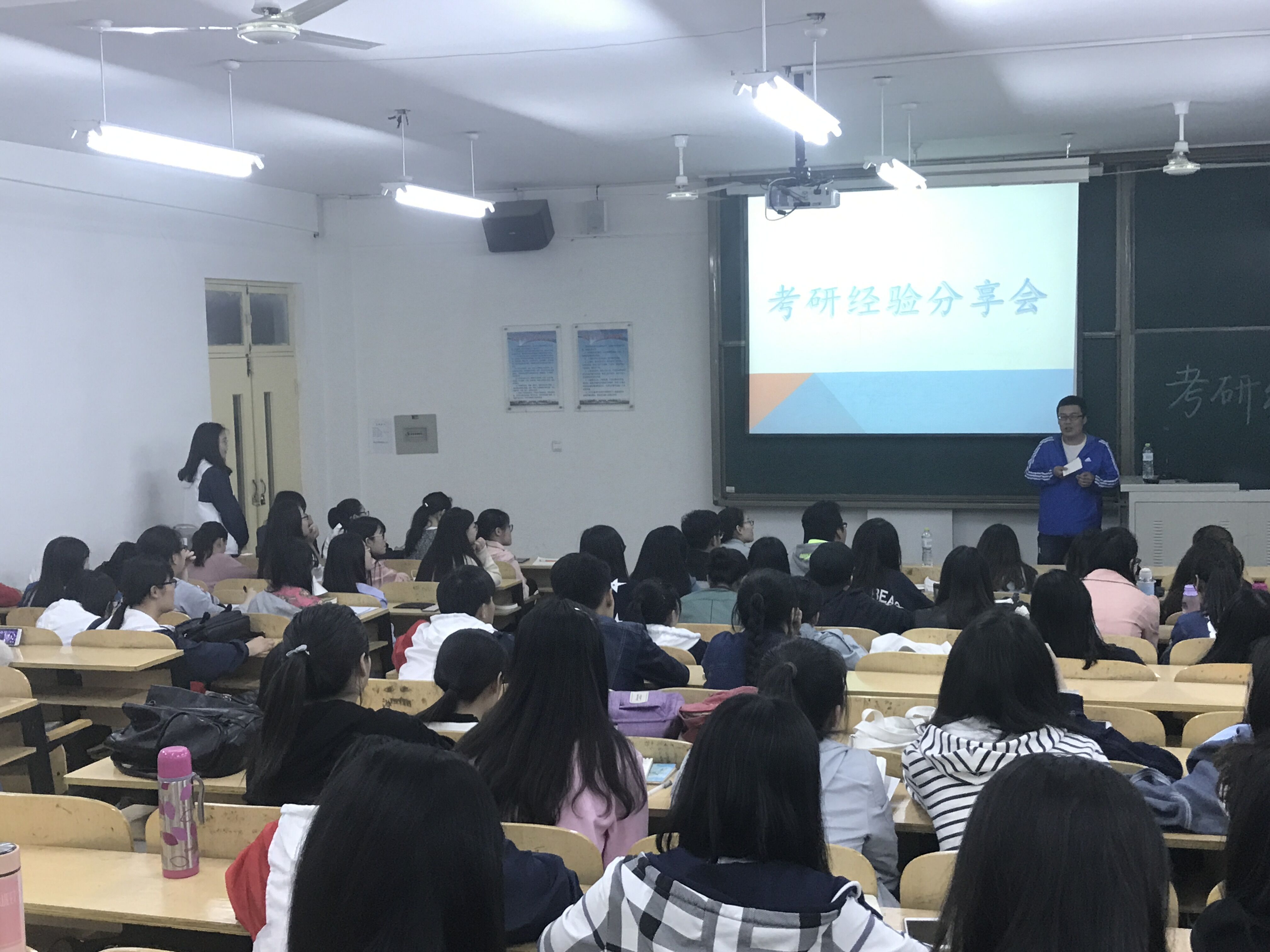 随着台下同学们热烈的掌声,首先上台为大家分享经验的是贾强强,他向大家简单介绍了一下考研的过程,讲解自己在考研路上需要的注意事项以及需要准备的材料,并向大家着重讲解了关于第二外语的考研方向。接着他给同学们分享了他自己的考研学习方式方法,他讲话幽默风趣,不时赢得同学们的阵阵笑声和掌声,让同学们在欢快的气氛中吸取着考研经验。第二位上台的是蒋艺,她为同学们分享的是她自己的考研经历,给大家讲了考研准备过程、考研报考学校的选择方向、如何调节好考研与其他事情的时间,以及在考研过程中的应试技巧,并回答了同学们的疑问。最后上台分享经验的是贾竹青,她主要是对前两个学长学姐的经验做的总结,并分享了自己的考研路程,位同学们排难解疑,并向大家说出了坚持本心不忘初衷的话语,鼓励大家在考研的路上不放弃,坚持下去。