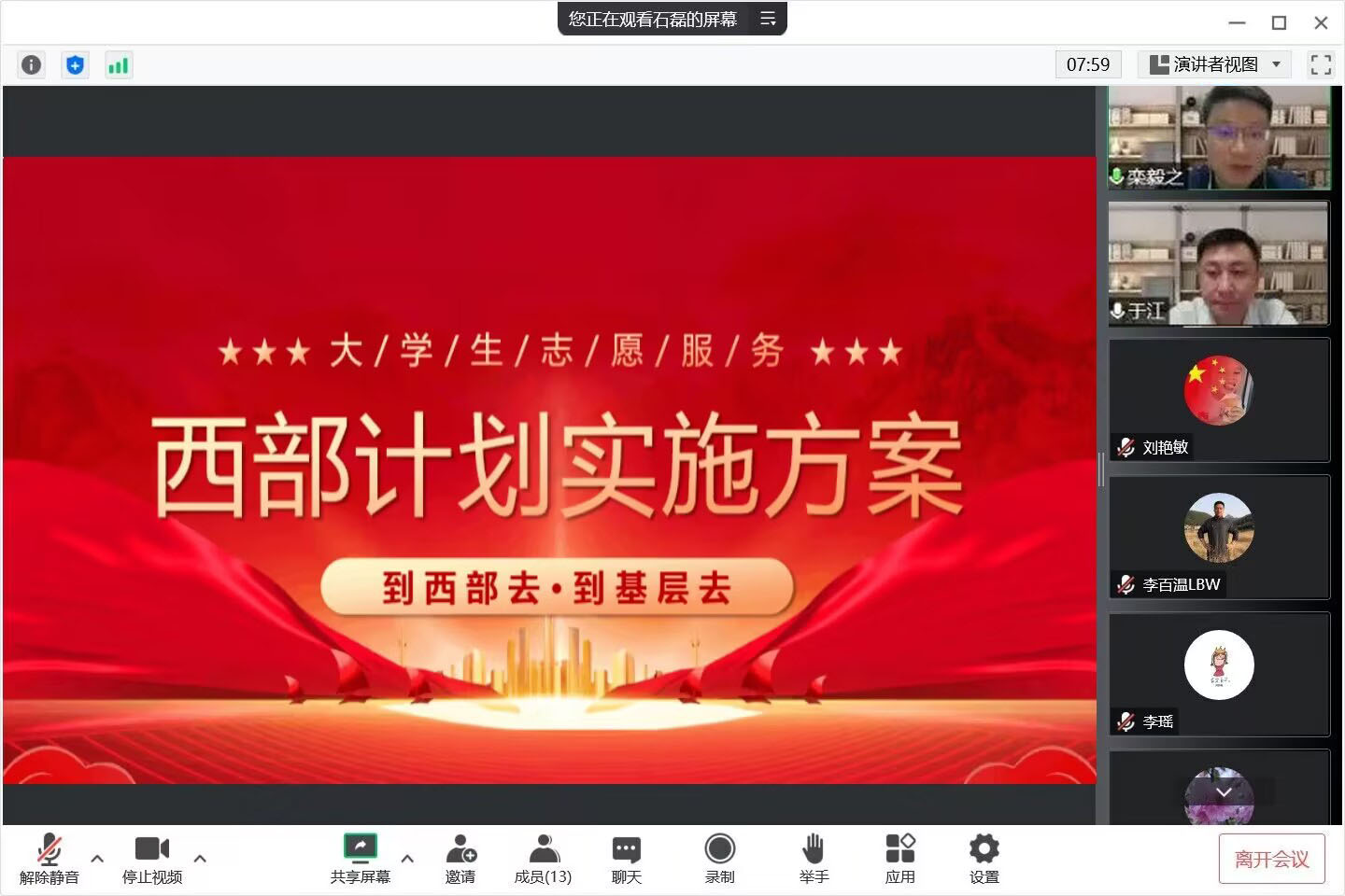 为进一步深化实施大学生志愿服务西部计划项目,引导和鼓励更多优秀的毕业生以志愿之名,赴西部之约,2022年3月15日,yl6809永利官网集团yl6809永利官网集团以线上的形式召开了“志愿传承奉献青春”西部计划教育主题活动。参与活动人员有yl6809永利官网集团党委书记于江,党委副书记栾毅之,石磊老师及2018级本科班、2019级专科班以及20级专升本班部分学生。