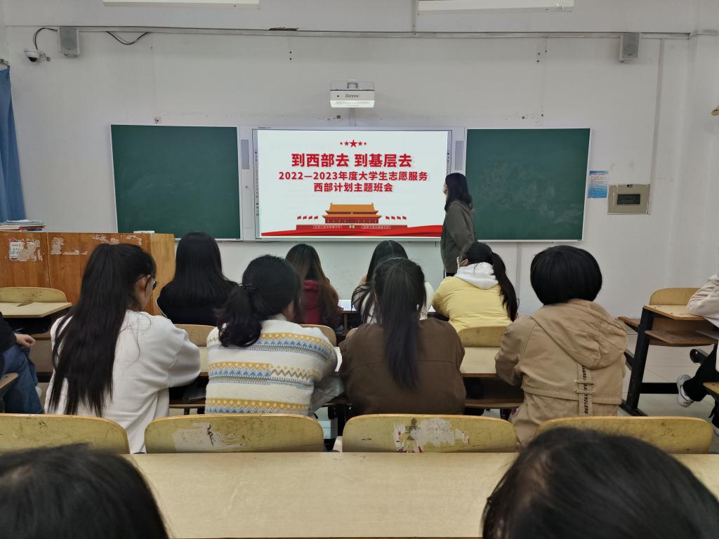 随后,他阐述国家对“西部计划”志愿者的政策组织保障、经费保障以及各种优越政策。他详细说明大学生参加“西部计划”对于自身塑造和锻炼成才的重要意义。他鼓励同学们在条件允许、家长同意的情况下,积极踊跃报名“西部计划”。