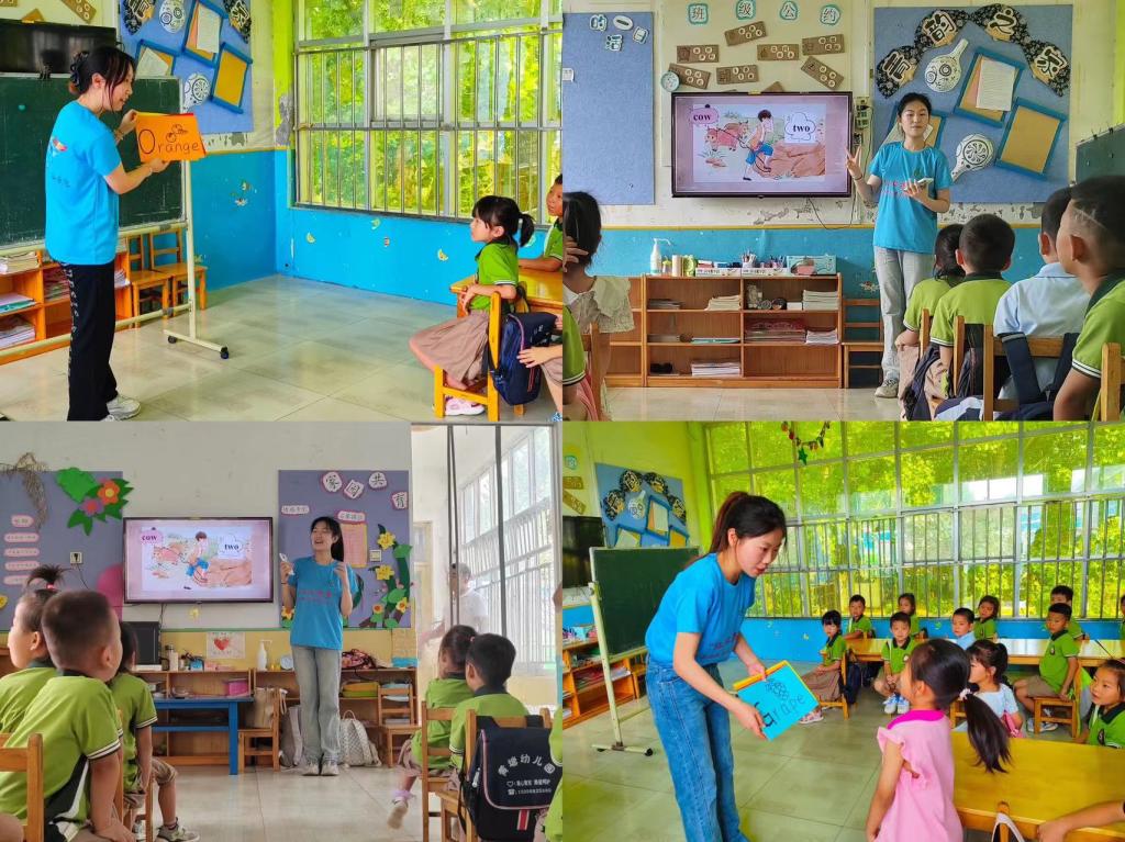 队员史婉佳向小朋友讲述水果的英文单词及学龄前英文字母。队员贺梦睿以幽默浅显易懂的方式,把英文单词与童话故事结合,有机融入教学。授课最后,大家合唱王二小放牛郎的歌曲,为孩子们带来了一场生动精彩的英语教学。